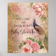 Um elegante sinal de boas-vindas ao Chá de fraldas que é personalizado com o nome da sua futura mãe. Vintage elegante Os pavões foram pintados em aquarela e misturados com elegantes florais de pénia rosa-pincel, rolhas de ouro e espirais e colididos com sutis elementos da epemera. Esta colagem foi projetada graficamente por uma artista e designer internacionalmente licenciada, Audrey Jeanne Roberts, copyright.