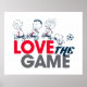 Confira Charlie Brown, Franklin, Peppermint Patty, e Snoopy correndo e jogando futebol juntos de uniforme, sobre as palavras: "Love The Game".