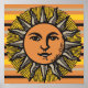 Sol de grande safra sorridente, com ilustração tipo recorte facial de madeira sobre fundo de listras em laranja, amarelo, preto. Feliz, artístico ensolarado e design divertido. Excelente para casa de praia ou decoração maximalista de boho.