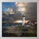 Foto de um farol com o poema Pegadas na Areia.