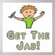 O gráfico "Get The Jab" mostra uma pessoa feliz com um polegar para cima e uma seringa encorajando as pessoas a terem o seu emprego. Um design de vacinação profilática para promover a absorção da vacina.