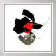 Ilustração de colagem digital com desenho de caneta e tinta de um pequeno peixe nadando entre paus de abstrato e algas. Cor vermelha, preta e esticada com influência asiática. Com a Mosca Pequena Pássaro. Artista, Margaret Loftin Whiting.