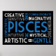 Apresentando palavras-chave (e cor azul) que descrevem os pontos fortes do nativo Pisceano, ou seja, o nascer sob o signo astrológico dos Peixes do peixe no Zodíaco.