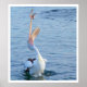 Fotografia de um pelicano na água capturando um peixe no ar.