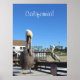 Dois pelicanos sentam-se calmamente no cais, com palmeiras e um brilhante céu azul de inverno como pano de fundo. A palavra "Califórnia!" é escrita em letras brancas no topo (pode ser personalizada).