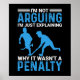 Poster da Penalty do jogador de hóquei com texto branco e azul em fundo preto diz que eu não estou discutindo só porque não foi uma penalidade! O poster de humor de hóquei certamente será um sucesso com qualquer jogador de hóquei também mostra jogadores de hóquei da silhueta azul.