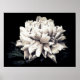 Foto preta e branca de um grande florescimento de pénia contra um fundo preto. A imagem é sempre tão ligeiramente tensa, adicionando tons sutis de roxo às pétalas.
