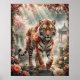 A majestic peony tiger strides through an imperial garden where strength meets floral luxury. Realistic tiger anatomy fuses with layered peony petals, elegant leaves, bold stripes, and rich botanical textures across its powerful body. Soft sunlight, drifting blossoms, stone pathways, and misty garden architecture create a cinematic upscale setting. This striking fantasy design adds drama, elegance, and confidence to modern interiors, offices, bedrooms, or statement gift collections. Perfect for tiger lovers, luxury decor fans, and floral wildlife art collectors.