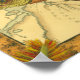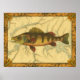 Esta impressão ilustra um quadro artístico de um peixe-perca amarelo. O plano de fundo exibe um mapa geográfico antigo em cores bege claro. A estrutura marrom se assemelha a um padrão antigo de madeira com flores amarelas-vermelhas nas bordas. Um excelente extra para a sua coleção de pesca!