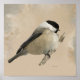 A small willow tit (Poecile montanus) white head, black cap and beard, with grey-buff feathers on the underside