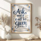 Inspira fé e positividade com esta arte de muro "Ask and It Will Be Dado", baseada em Matthew 7:7. O design apresenta um roteiro elegante rodeado de ouro e folhagem azul, fazer uma bela adição a qualquer sala. Seja para sua própria casa ou como um presente pensativo, esta peça serve como um poderoso lembrete do poder da oração e da fé.