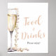 A "Comida de Champanhe Dourada e Prosecco" é uma adição elegante à decoração do evento, com pérolas sofisticadas e motivos prosecco. Exibido com destaque, este poster serve como guia de na moda para convidados, destacando a seleção de comidas e bebidas disponíveis. Ele dá um tom sofisticado para a celebração e adiciona um toque de luxo ao ambiente geral.