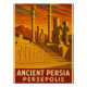 Poster de viagens retrô da Pérsia Antiga, com as ruínas de Persépolis. Primeiro plano: escadaria larga de pedra esculpida com alivios de soldados persas em cerimonial, viagem irã