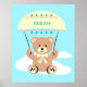 Cute teddy bear gliding on parachute with fluffy clouds on a light blue sky. Personalize with child's name. Colors are also customizable.