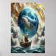 Uma pintura surreal representando um pescador em um pequeno barco, se rebelando em uma baleia azul gigante conectada a uma orbe azul giratória, tudo contra um pano de fundo de nuvens de ouro e ondas dramáticas.