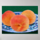 Pêssegos maduros estão em uma placa azul, só pronta para comer. O original é uma pintura em miniatura de óleo por Kathie Miller