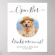 Abrir Bar! Caligrafia simples, mas elegante, esta placa de bar de casamento mostra bar aberto em caligrafia elegante, e Bebidas estão em nós. Personalize esta placa de casamento elegante com sua foto favorita de animal de estimação, foto de cão, foto de noivado ou foto de casal, nomes e data! COPYRIGHT © 2020 Judy Burrows, Black Dog Art - Todos Os Direitos Reservados. Pet Dog Wedding Open Bar Bebidas Personalizadas No Poster