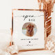 Este lindo Sinal de Bar Aberto apresenta uma elegância minimalista maravilhosamente moderna para mostrar no seu casamento ou evento especial. Edite facilmente a maioria dos textos para corresponder ao seu estilo. As cores de texto e de fundo são totalmente editáveis —> clique no botão "Editar usando a ferramenta Design" para editar!
