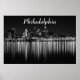 Esta é a lindíssima linha do horizonte da cidade de Filadélfia, tirada à noite do outro lado do rio Delaware, na margem de Camden. A arquitetura dos arranha-céus e edifícios de Filadélfia estão expostos nesta foto em preto e branco. Center City, a área centro de Filadélfia, é o foco desta fotografia. As luzes da cidade lançam reflexões sobre a água.