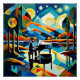 A.I.criada impressão de cena vibrante mostra uma pessoa tocando piano contra um céu noturno estrelado e mesmerante sobre um cubista colorido, a paisagem surreal inclui colinas rolantes, árvores e um lago refletindo os corpos celestes luminosos do céu