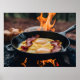 Perfeição Piquenique: Bacon e Ovos Fritados numa Habilidade de Ferro-Ferro em Meio à Natureza. Esta cena de regar a boca captura a essência do cozinhar ao ar livre com ovos e bacon se dimensionando sobre um fogo aberto
