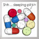 Uma imagem de um belo grupo colorido de pílulas ou medicação com rostos adormecidos. A legenda acima diz: "Shh ... babaca". Seria excelente utilizar num quarto, consultório médico, escritório de psicólogos, ou em qualquer lugar que se vendesse ou utilizasse comprimidos. Imagem engraçada criada por Christie Black of Creations do Heart.