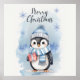 Uma ilustração encantadora de inverno de um adorável pinguim vestindo um chapéu e cachecol listrados, trazendo uma vibração acolhedora e festiva. Os flocos de neve suaves e tons azuis suaves no fundo criam uma atmosfera mágica de inverno. Perfeito para cartões de Natal, posters, adesivos e artesanatos sazonais!