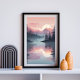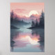 Um grande sol pálido se põe atrás de camadas de montanhas de cor rosa, perfeitamente espelhadas em um lago tranquilo com pinheiros silenciosos. Essa cena tranquila evoca calma e serenidade, fazer uma peça de parede ideal para amantes de mínima arte natural e tons de calmante.