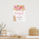A bright and joyful graduation welcome design featuring hand-painted florals in pink, coral, peach, golden yellow, and soft greenery. The bold blush script headline creates a warm first impression, while the airy white background keeps the layout clean and modern. Watercolor blooms frame the top and corner of the design, giving it a fresh garden-inspired feel without overwhelming the text. This layout works beautifully at the entrance of a graduation party, guiding guests while adding a polished decorative touch.
