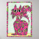Decorem suas paredes em estilo com este poster único e colorido de arte popular. Nesta trabalho de arte, cinzenta e branca, esta feliz gata rosa se posiciona para o espectador, mostrando sua paisagem única e suas marcas de bolinhas. As formas de paisley contêm lindas flores cor-de-rosa, bordadas por roxo.