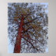 Um pinheiro alto, com tronco vermelho, atinge o céu.