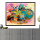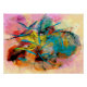 Vibrantes espirais de cor dominam a composição, com derrames energéticos de amarelo, azul e vermelho tecendo sobre fundo rosa e bege macio. O arranjo da abstrato transmite uma sensação de movimento e caos, evocando uma energia viva e dinâmica.