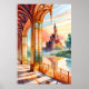 Uma pintura de castelo cativante oferece uma visão de um corredor texturizado a ouro dentro do edifício encantador. Esta cena de conto de fadas invoca um sentido de magia e maravilha, como se o feitiço de um bruxo transformasse o comum em extraordinário. O trabalho de arte capta o charme caprichoso de um mundo de fantasia. Pintura de arte para a decoração. Você pode comprar com papel de quadro e impressão de arte. Tamanho original da imagem de arquivo: 27'x40' polegadas (300 dpi).