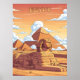 Uma ilustração estilizada das Pirâmides do Excelente de Giza e do Esfingx sob um vibrante e turvo céu laranja, evocando uma sensação de maravilha antiga.