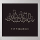Esta design apresenta um desenho desenhado manualmente do horizonte de Pittsburgh sobre um fundo de cinza escura.
