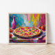 Uma pintura moderna divertida e divertida de uma pizza, com pinceladas de abstrato texturizadas em cores brilhantes como rosa, amarelo e azul. As cores audaciosas e o trabalho de bruxaria animado dão à pizza uma vibração certeira e enérgica, combinando imagens de comida com um estilo de arte criativo e contemporâneo. Essa peça peculiar reúne a cultura pop e o expressionismo abstrato, acrescentando um toque de humor e diversão a qualquer cenário.