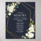 Moderno e sofisticado, este letreiro de casamento "em memória amorosa" apresenta um falso cobre geométrico decorado com arranjos florais brancos em aquarela e folhagens de eucalipto, sobre uma textura azul-marinho moderna. Parte de uma coleção combinando. Veja a coleção completa aqui: https://www.zazzle.com/collections/copper_geometric_white_blue_elegant_floral_wedding-119426320773611020 Copyright Elegant Invites, todos os direitos reservados.