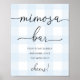 Esta placa de barra de mimosa para chá de bebê menino gingham azul é perfeita para um chá de bebê simples. O design moderno apresenta um design gingham azul atemporal e fontes modernas.