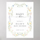 Uma Placa de Boas Vindas para Chá de Bebê Bebê em Flor com uma bela moldura floral em aquarela combinada com uma fonte clássica e script. Perfeito para um Chá de Bebê de Primavera ou Verão.