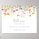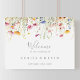Esta placa de boas-vindas de casamento de flores silvestres coloridas do prado é perfeita para um casamento rústico. O design apresenta flores de prado multicoloridas em verde, rosa, blush, amarelo, roxo, em aquarela.