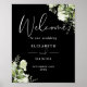 Esta placa de boas-vindas de casamento em preto e branco com folhas verdes elegantes pode ser personalizada com suas informações em tipografia sofisticada. Projetada por Thisisnotme©