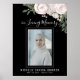 Este elegante sinal de boas-vindas de mulher floral funeral apresentando um buquê exuberante de rosas cor-de-rosa e flores rústicas, uma foto de seu ente querido em moldura branca, seu nome e datas de vida e o texto em memória amorosa em um fundo preto simples.