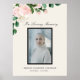 Este elegante sinal de boas-vindas de mulher floral de funeral apresenta rosas em aquarela rosa desbotado e bege suave, folhas verdes, uma foto de seu ente querido em moldura preta, seu nome e datas de vida. O fundo deste memorial é marfim.