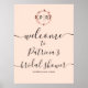 Um simples e chique letreiro de boas-vindas para chá de noiva em papelão espuma com monograma em dourado rosa e folhagem, em cor de rosa pêssego. Fácil de personalizar com seus detalhes. Letreiro de boas-vindas para chá de noiva moderno boho em papelão espuma editável, personalizável, fonte manuscrita caligráfica, simples, elegante.