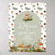 Linda placa de boas-vindas com tema de cogumelos com flores silvestres e detalhes de abelhas. Este pôster editável é perfeito para qualquer festa de 1º aniversário com tema de floresta outonal, chá de bebê, chá de noiva ou qualquer evento.