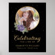 Elegante placa de boas-vindas de foto funeral personalizada preta, roxa e dourada com uma moldura de foto dourada adornada com rosas roxas.