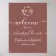 Um simples e chique letreiro de boas-vindas para jantar de ensaio em papelão espuma, com monograma em folha metálica falsa e folhagem em terracota. Fácil de personalizar com seus detalhes. Letreiro de boas-vindas para jantar de ensaio moderno boho em papelão espuma editável, convite de casamento com foto e guirlandas, personalizável, fonte manuscrita caligráfica, simples, elegante.