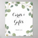 Esta placa de caligrafia de folhagem verde e presentes é perfeita para um casamento rústico ou chá de noiva. O design apresenta ramos e folhas de eucalipto verde botânico desenhados à mão.
