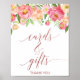 Este sinal de cartões e presentes de ouro rosa peônia rosa e pêssego é perfeito para um casamento elegante ou chá de noiva. O design floral apresenta uma bela composição de peônias em aquarela em tons de rosa e coral combinados com uma delicada caligrafia em folha de ouro rosa falso. A linha de texto na parte inferior do sinal pode ser personalizada com a data, os nomes da noiva e do noivo, ou uma mensagem curta como "Obrigado".