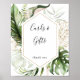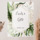 Este letreiro geométrico de ouro e verde tropical para cartões e presentes é perfeito para um casamento ou chá de noiva em um destino paradisíaco. O design apresenta folhas de palmeira e banana pintadas à mão em aquarela dourada e verde com flores cor-de-rosa agrupadas em buquês, adornando uma moldura geométrica.